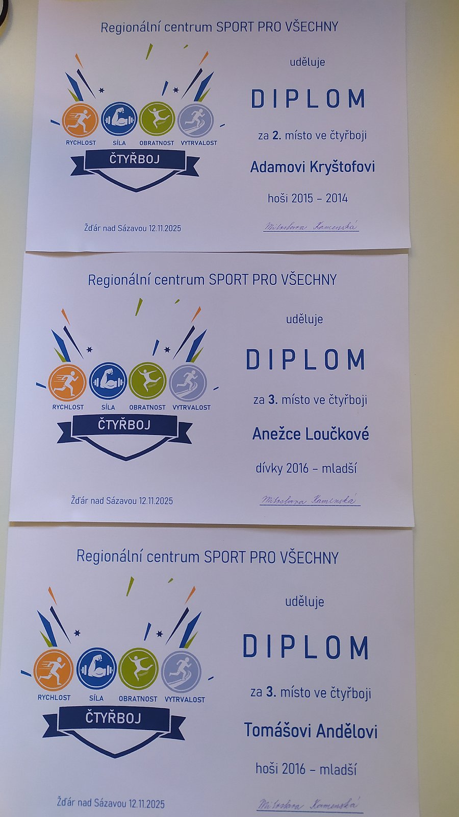Soutěžili jednotlivci ve čtyřech disciplínách: šplhu, hodu medicinbalem do dálky, skoku z místa a člunkovém běhu. Všichni předvedli skvělé sportovní nasazení a snahu podat co nejlepší výkony. Naše škola vyslala do soutěže 8 zástupců. Do krajského kola postoupili tři z nich-Anežka Loučková, Tomáš Anděl a Adam Kryštof. Gratulujeme a přejeme hodně štěstí v krajském kole!