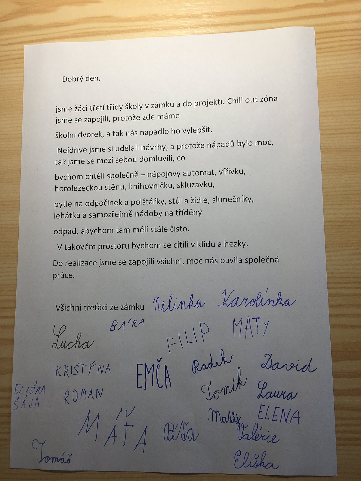 Tento rok se naše třída 3. Z zapojila do projektu firmy Hettich Chill out zóna. A protože zde u školy máme školní dvorek, tak záměr a místo